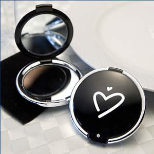 It's always a great time for reflection with these Styling Black Heart Design Compact Mirror Favors Heart warming memories of your special event will shine through each time your guests peer into these exclusive mirror compact favors. Each 2 ½" round compact features a sturdy hinged construction with a silver plated bottom and a high gloss black lid decorated with a white silkscreened freeform heart design and embedded rhinestone. Ready for a beautiful presentation at any love filled event, each comes slipped into a protective black felt pouch and packaged inside a white gift box. Facts and Features Measures 2 ½" round and features sturdy, hinged construction Silver plated bottom and high gloss black lid with silkscreened heart design and embedded rhinestone Packaged in a black felt pouch within a white gift box Shipping weight 0.13 lbs